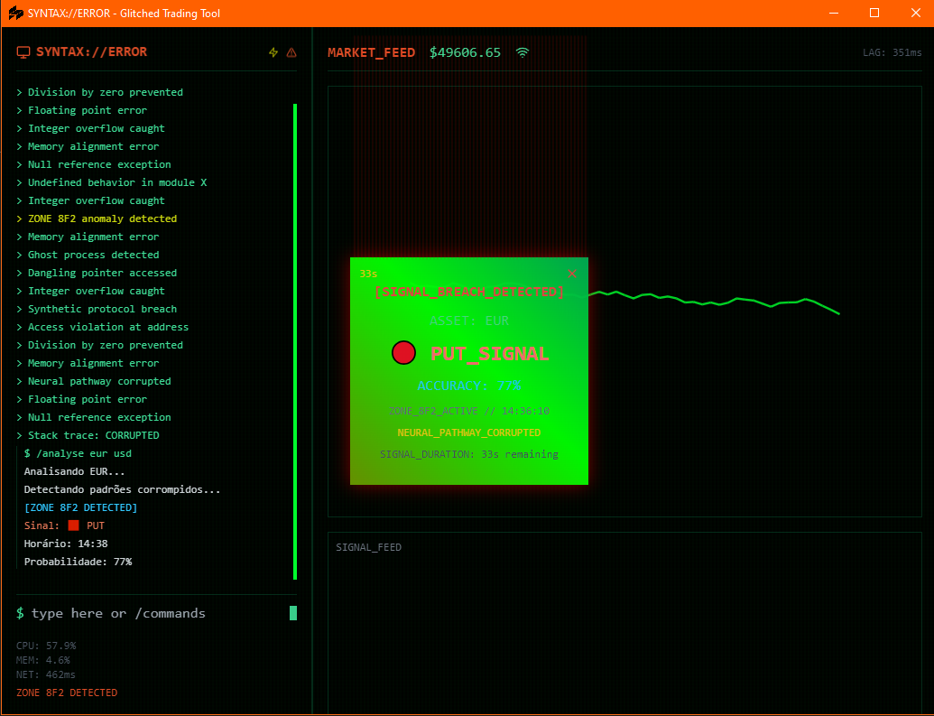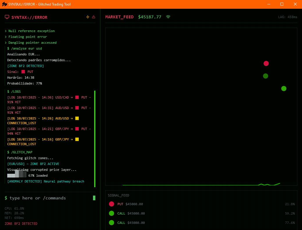 It reads assets, processes behavior, returns signals, and identifies unstable zones — all through a clean, command-based interface used by real traders.